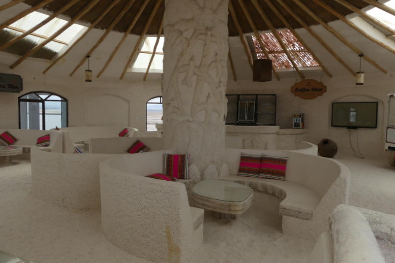 We returned to our hotel, with many other tourists making their way across the salt flats. Our accommodation was in a salt hotel called Hotel de Sal Cristal Samaña. It was a very nice concept. The floor was covered in salt in the main areas. Much of the furniture was carved out of salt, couches and tables, the TV shelf and the bedhead.