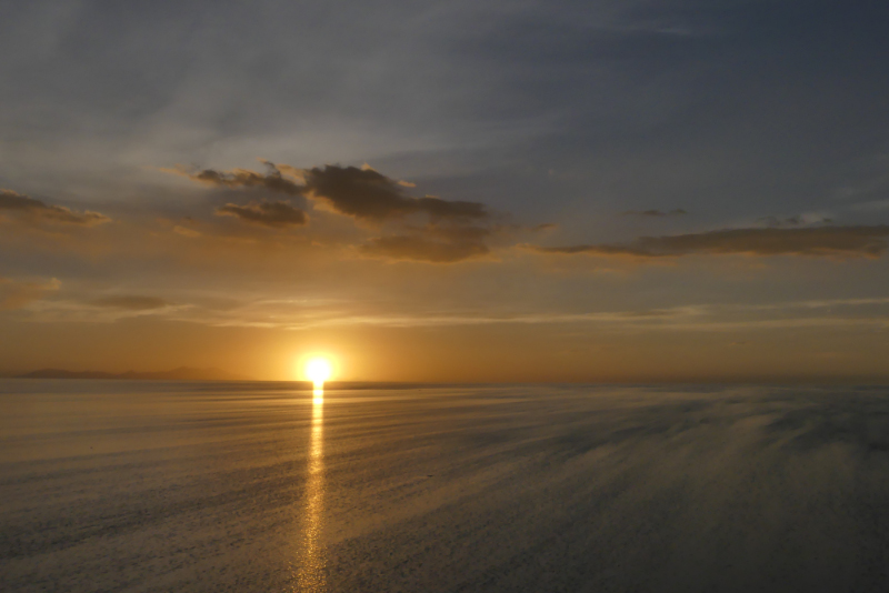 We then waited 1½ hours for the sunset. It was a long tedious wait, and we really wondered if it was worth the time sitting and waiting. The wind blew so strongly that we found it difficult to stand up straight in a few centimetres of water. But after the long wait, the sun finally dropped below the lake and it was spectacular. Lillian told is it was the first sunset she had seen in her 3 months as a guide – we were lucky!